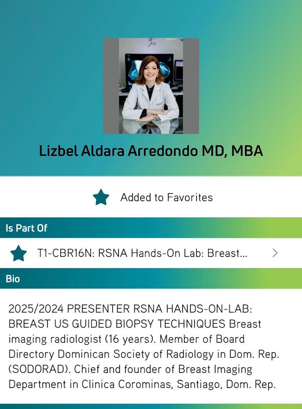 La Dra. Lizbel Arredondo de República Dominicana estará presente durante la RSNA en Chicago este año, impartiendo por segundo año consecutivo un taller biopsias de mama por US