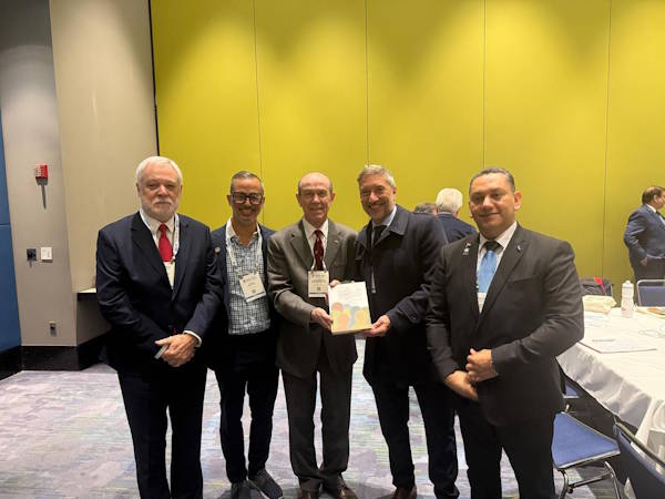 A fotografia mostra o Dr. Luis Ros Mendoza, no centro da imagem, entregando uma cópia impressa do livro ao presidente do CIR, Dr. Claudio Bonini, ladeado pelos membros da Diretoria do Colégio, da esquerda para a direita, Dr. Ángel Gayete, presidente eleito, Dr. Jorge Vidal, secretário, e Dr. Carlos Quirós, tesoureiro.